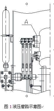 圖1所示為液壓缸與蓄能器間的連接管路,為實(shí)現(xiàn)蓄能器對(duì)液壓缸快速補(bǔ)壓緩沖作用,A處設(shè)計(jì)較大直徑管道接口,圖1中A處的原密封形式詳見(jiàn)圖2。圖2中的分油管一端連接高壓膠管,另一端焊接法蘭1,法蘭1與液壓缸法蘭采用螺栓連接,兩法蘭是采用一道端面O型圈(圖2中密封處1)實(shí)現(xiàn)密封。