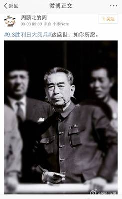 讓人難忘的細(xì)節(jié)不僅僅在閱兵場(chǎng)上。3日上午9時(shí)30分,習(xí)近平主席偕夫人彭麗媛正在天安門迎候各國(guó)嘉賓,閱兵尚未正式開始,會(huì)場(chǎng)內(nèi)外興奮期待的氛圍漸濃。就在此時(shí),網(wǎng)友“周顧北的周”發(fā)布了一條微博“這盛世,如你所愿”,配圖是一張周恩來總理的老照片。短短的七字微博引發(fā)了網(wǎng)友的強(qiáng)烈共鳴,轉(zhuǎn)發(fā)已過百萬?!伴_國(guó)大典的時(shí)候飛機(jī)不夠,周總理說飛兩遍,現(xiàn)在再也不需要飛兩遍了,要多少有多少。山河猶在,國(guó)泰民安。當(dāng)年送你的十里長(zhǎng)安街,如今已是十里繁榮?!?/p>