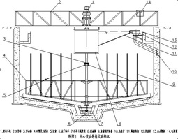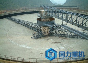濃縮機(jī)一般主要由濃縮池、粑架、傳動裝置、粑架提升裝置、給料裝置、卸料裝置和信號安全裝置等組成。工作的主要特點是在待濃縮的礦漿中添加一定量的絮凝劑,使礦漿中的礦粒形成絮團(tuán),加快其沉降速度,進(jìn)而達(dá)到提高濃縮效率的目的。