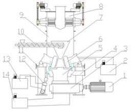 1 主電動機(jī) 2 磨輥稀油站 3 減速機(jī) 4 機(jī)座(進(jìn)風(fēng)口)
