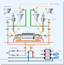 雙進(jìn)雙出球磨機(jī)具有兩個完全對稱的粉磨回路,其工作原理如下:原煤通過能自動控制速度的給煤機(jī)進(jìn)入落煤管,靠重力的作用落入輸送裝置的下方,被旋轉(zhuǎn)的絞籠送入磨煤機(jī)的筒體,旋轉(zhuǎn)的筒體內(nèi)裝有一定量的鋼球,把原煤研磨成煤粉。一次風(fēng)從磨煤機(jī)兩側(cè)的中空管進(jìn)入磨機(jī)的筒體,對原煤和煤粉進(jìn)行干燥,并將磨制好的煤粉通過絞籠體的環(huán)形通道輸送到磨煤機(jī)上方的分離器中,不合格的粗煤粉返回筒體內(nèi)重新粉磨,合格的細(xì)粉被送到鍋爐的燃燒器。部分一次風(fēng)進(jìn)入混料箱,對原煤進(jìn)行充分預(yù)干燥后進(jìn)入磨煤機(jī)分離器,與入磨一次風(fēng)混合,共同完成對煤粉的進(jìn)一步干燥和輸送。