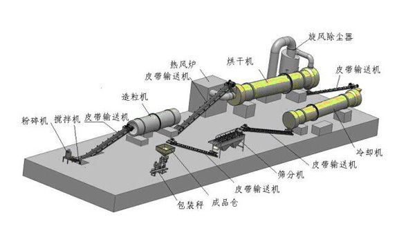 復(fù)合肥生產(chǎn)線工藝流程即原料配料→攪拌混合→粉碎結(jié)塊→造粒→一級篩分→顆粒烘干→顆粒冷卻→二級篩分→成品顆粒包膜→成品定量包裝。